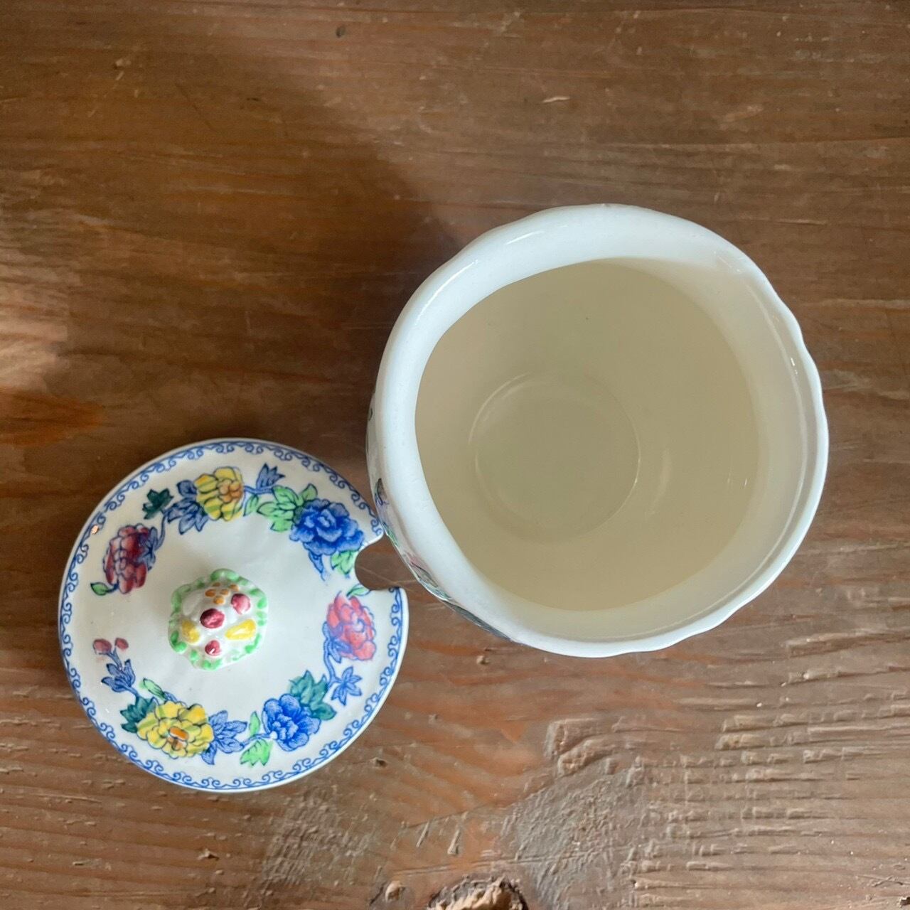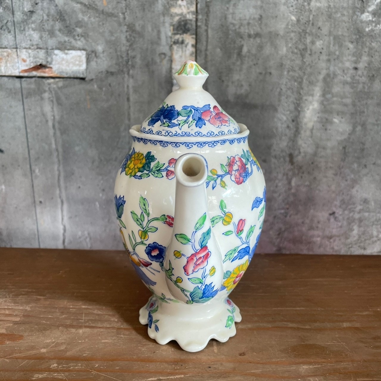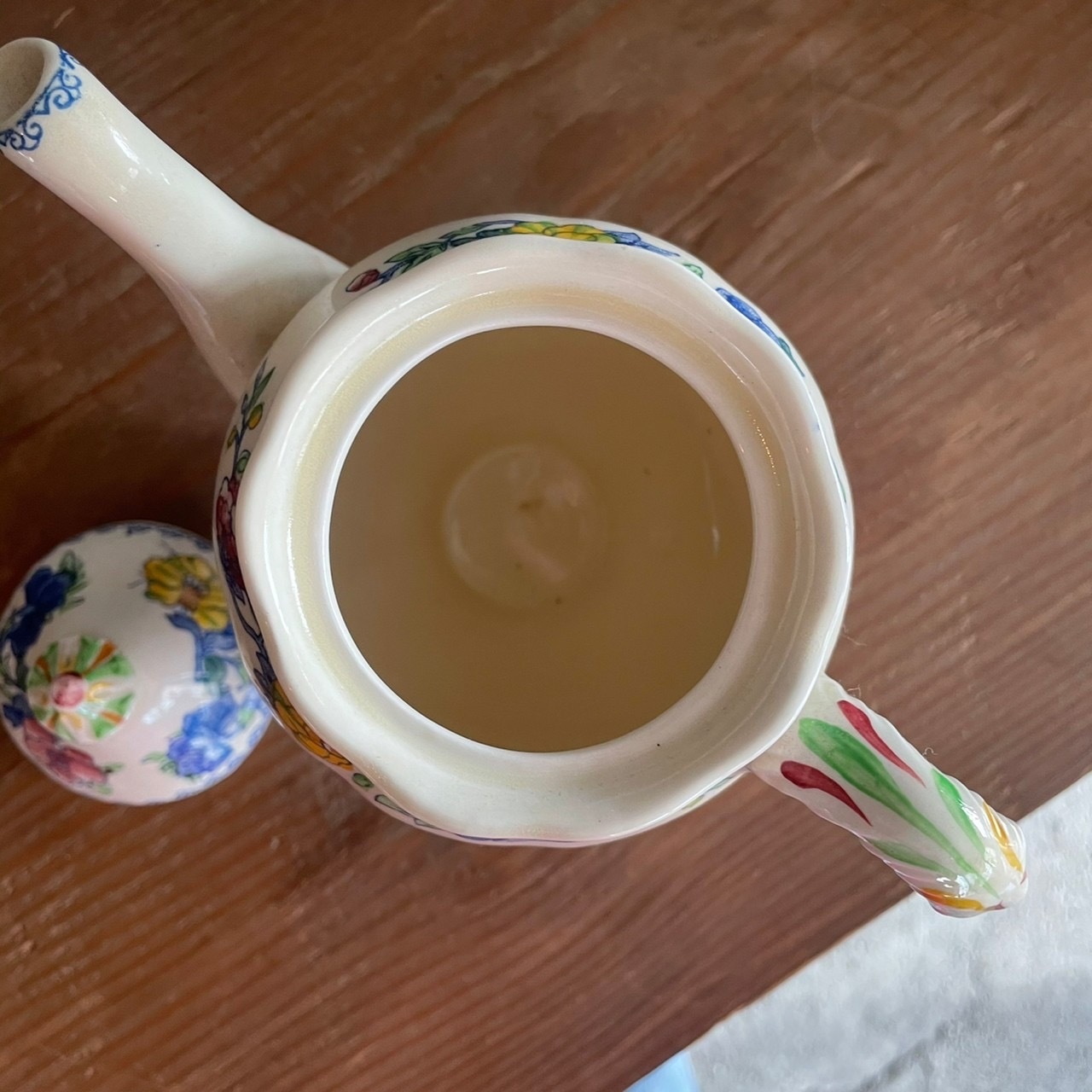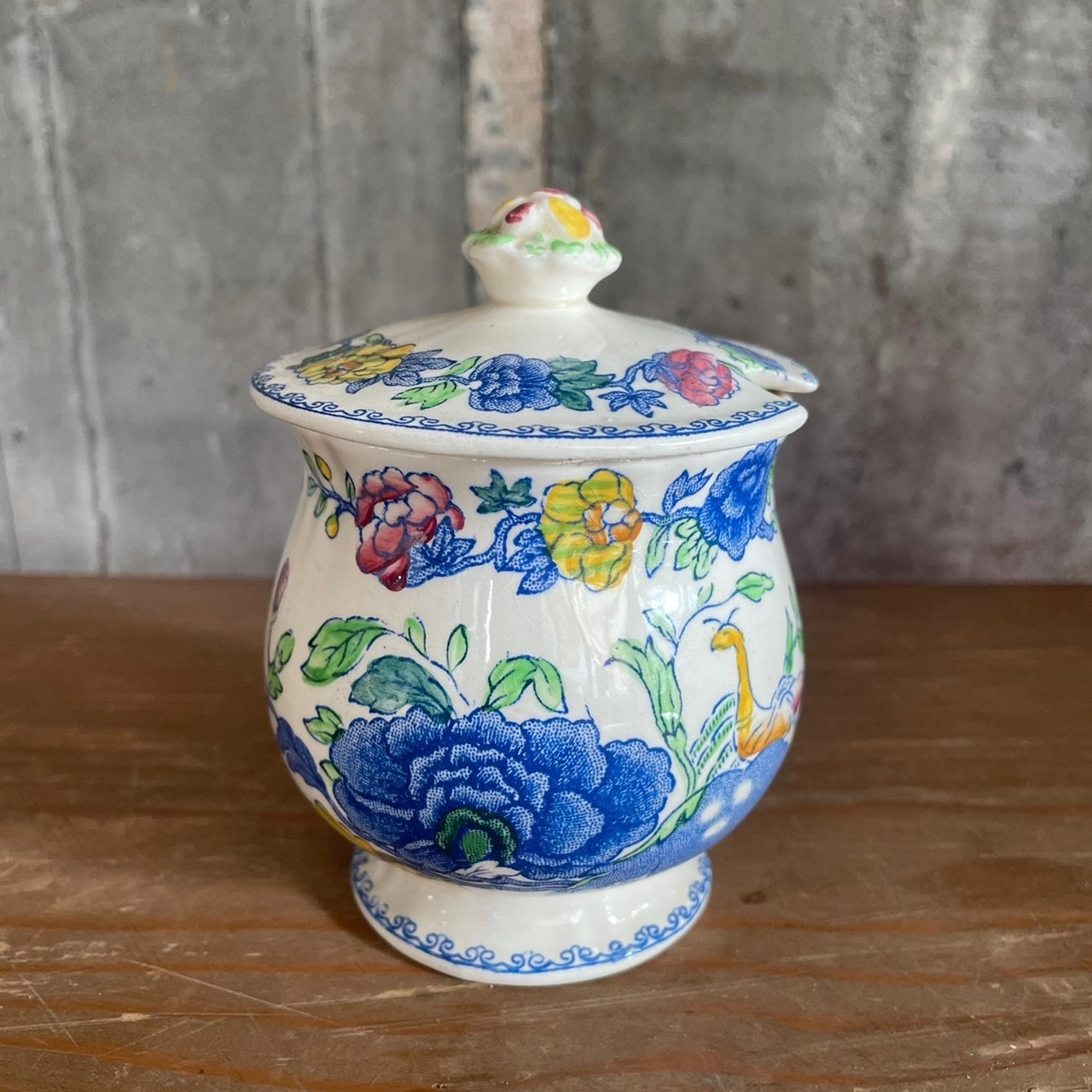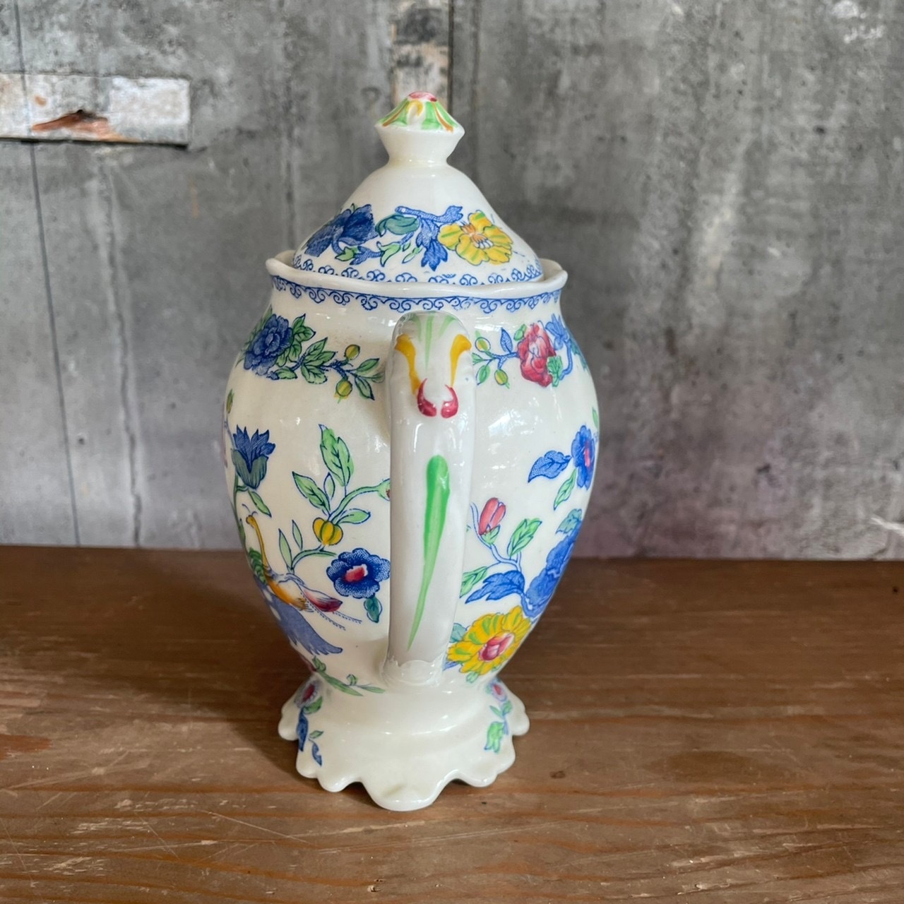 鮮やかな花柄が目を引くティーポットとシュガーポットのセット。