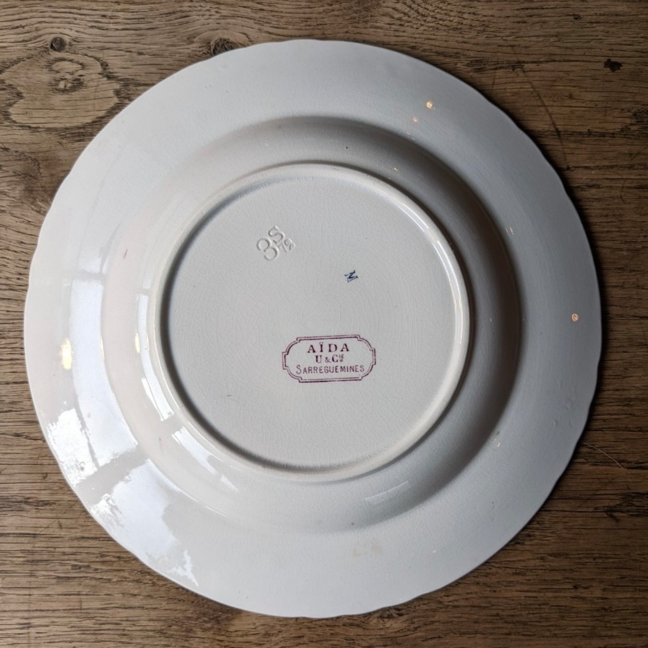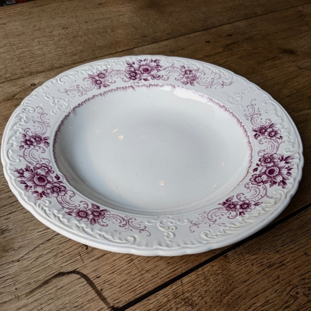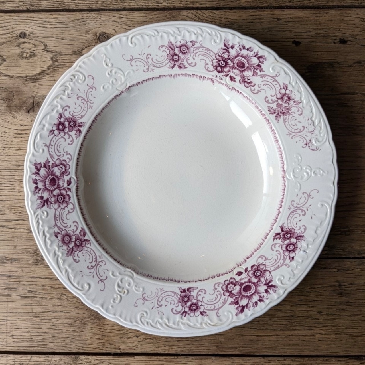 縁にはレリーフ模様が施され、ボルドー、パープル色の花柄が華やかに描かれています。