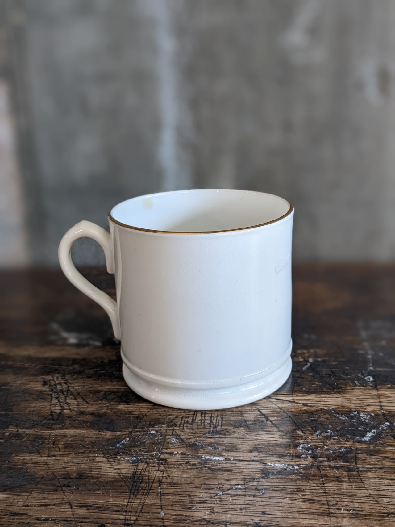 ストレート型のシンプルなマグカップに、紋章とゴールドの縁取りが映えるクラシカルなデザイン。