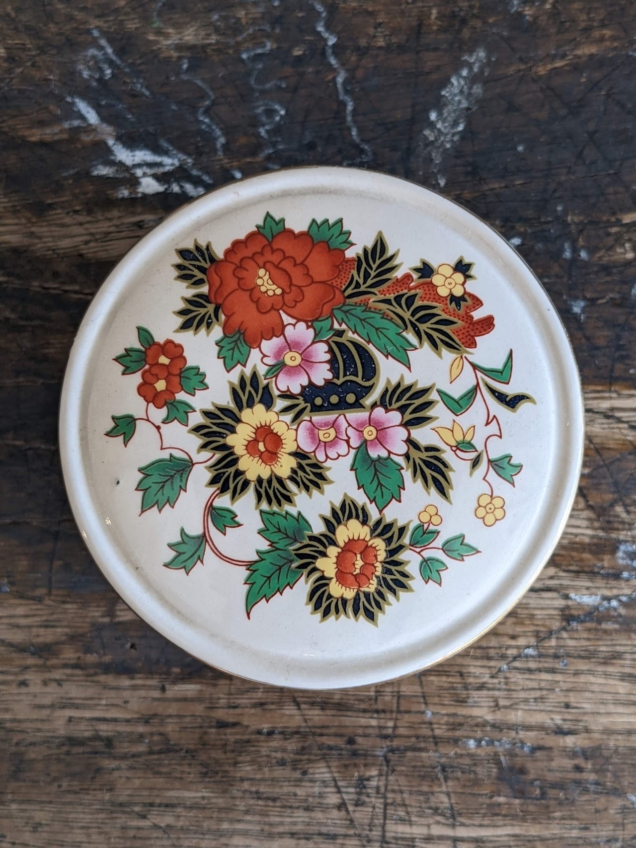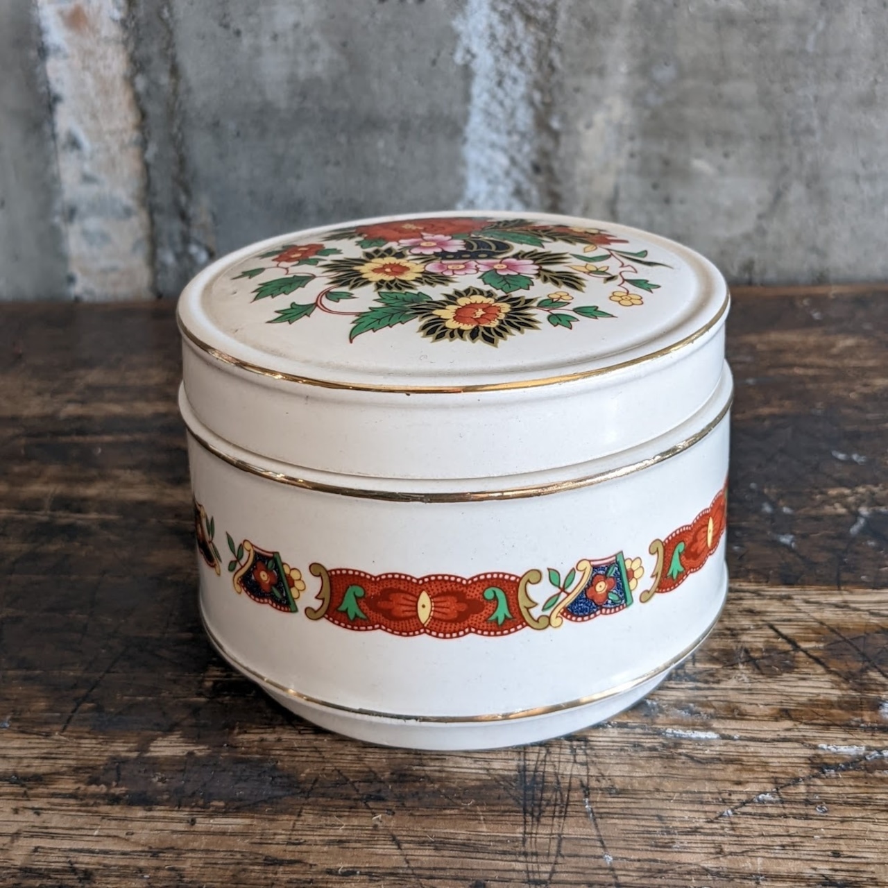 蓋には華やかな花模様(牡丹や菊を思わせるデザイン)、胴にはオリエンタル調の装飾帯が描かれ、金彩がアクセントになっています。