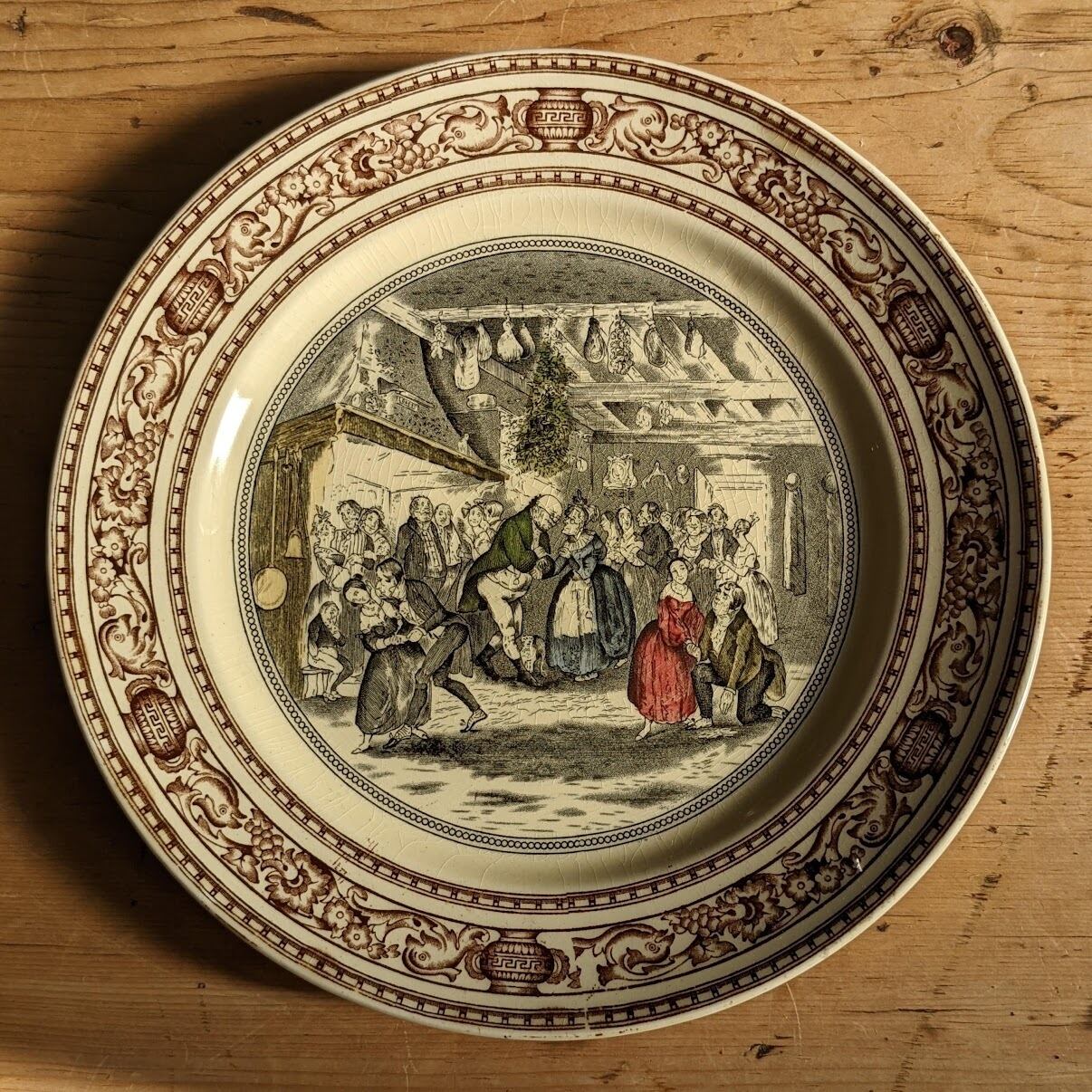 農家の納屋を舞台に、人々が集い踊る祝宴のシーンが描かれた印象的な一枚です。中央の情景と、縁を彩るクラシカルな装飾の対比が美しく、ディスプレイとしても存在感抜群。